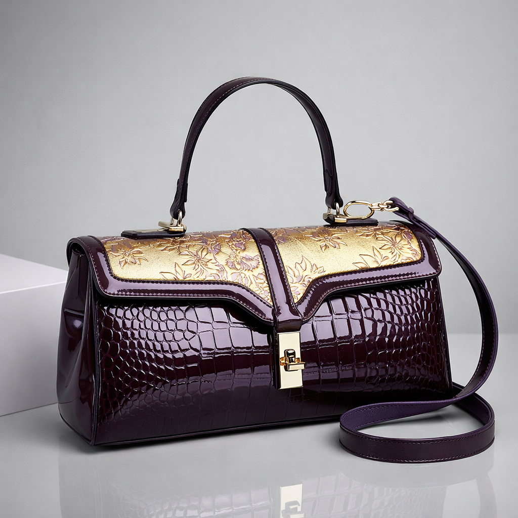 Designed for confident, everyday elegance, this structured handbag balances bold texture with refined detailing. A glossy croc-embossed body is paired with a three-dimensional embossed floral top panel, creating depth, contrast, and presence without feeling overstated. Finished with a sculpted top handle, polished gold hardware, and a secure lock closure, it transitions effortlessly from day wear to evening occasions.