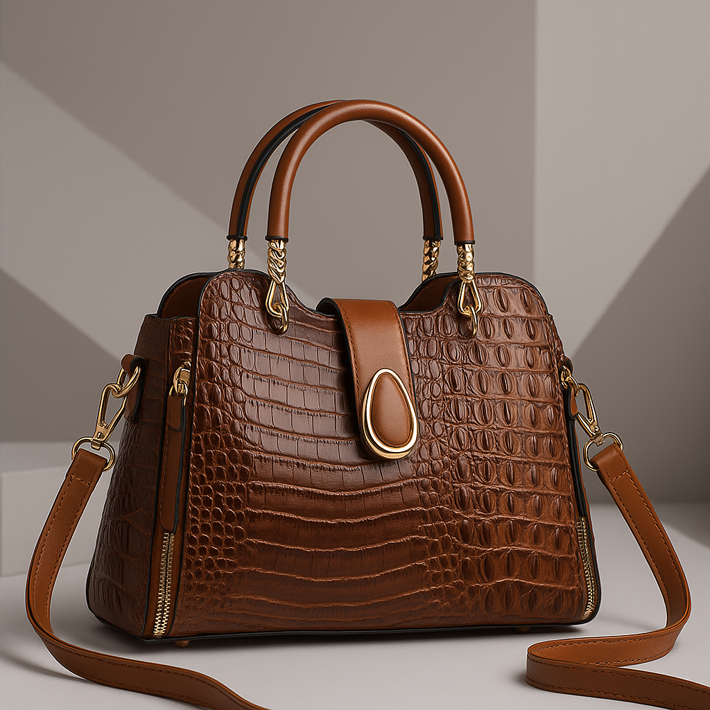 A structured croc handbag with a clean, refined silhouette and a glossy finish that looks instantly polished. The teardrop gold clasp adds a distinct signature detail, and the shape stays firm throughout the day for a consistently sharp look. With dual-carry options and a spacious interior, it balances style and practicality without trying too hard — a reliable, premium piece for everyday use.