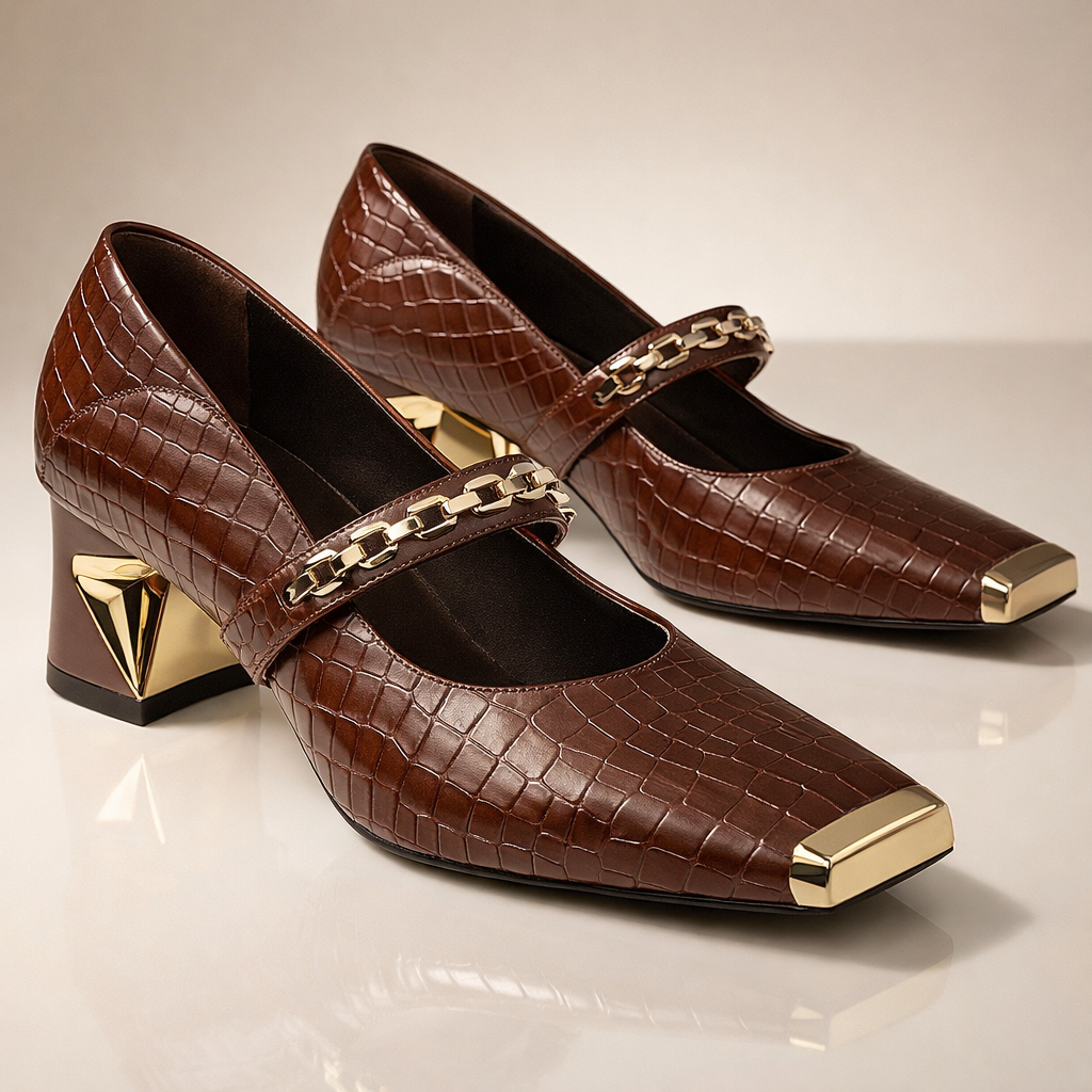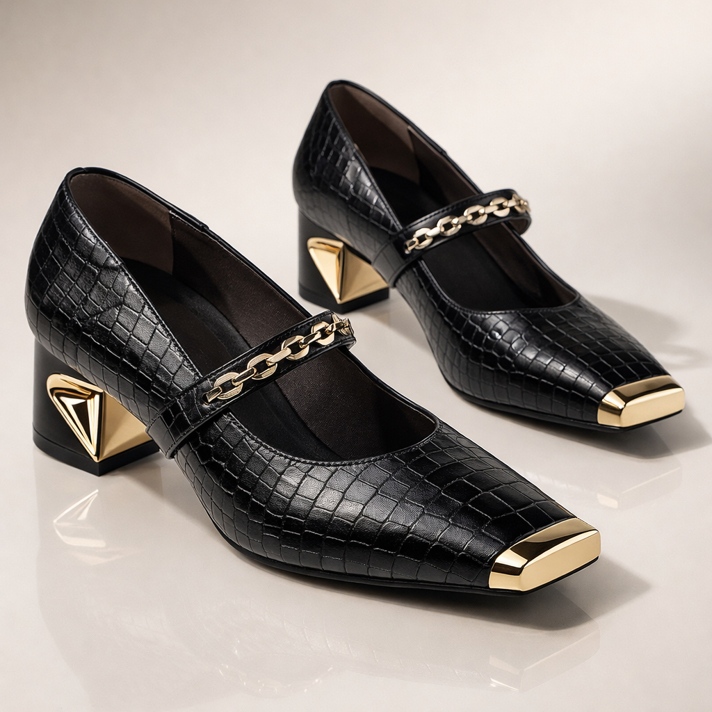 Designed with a sharp square toe and a balanced block heel, this style offers a confident, structured look while remaining comfortable enough for extended wear. The croc-embossed leather adds depth and definition, while considered gold detailing at the toe, strap, and heel brings a refined finish. Built to feel secure, supportive, and composed from the moment you step into them.