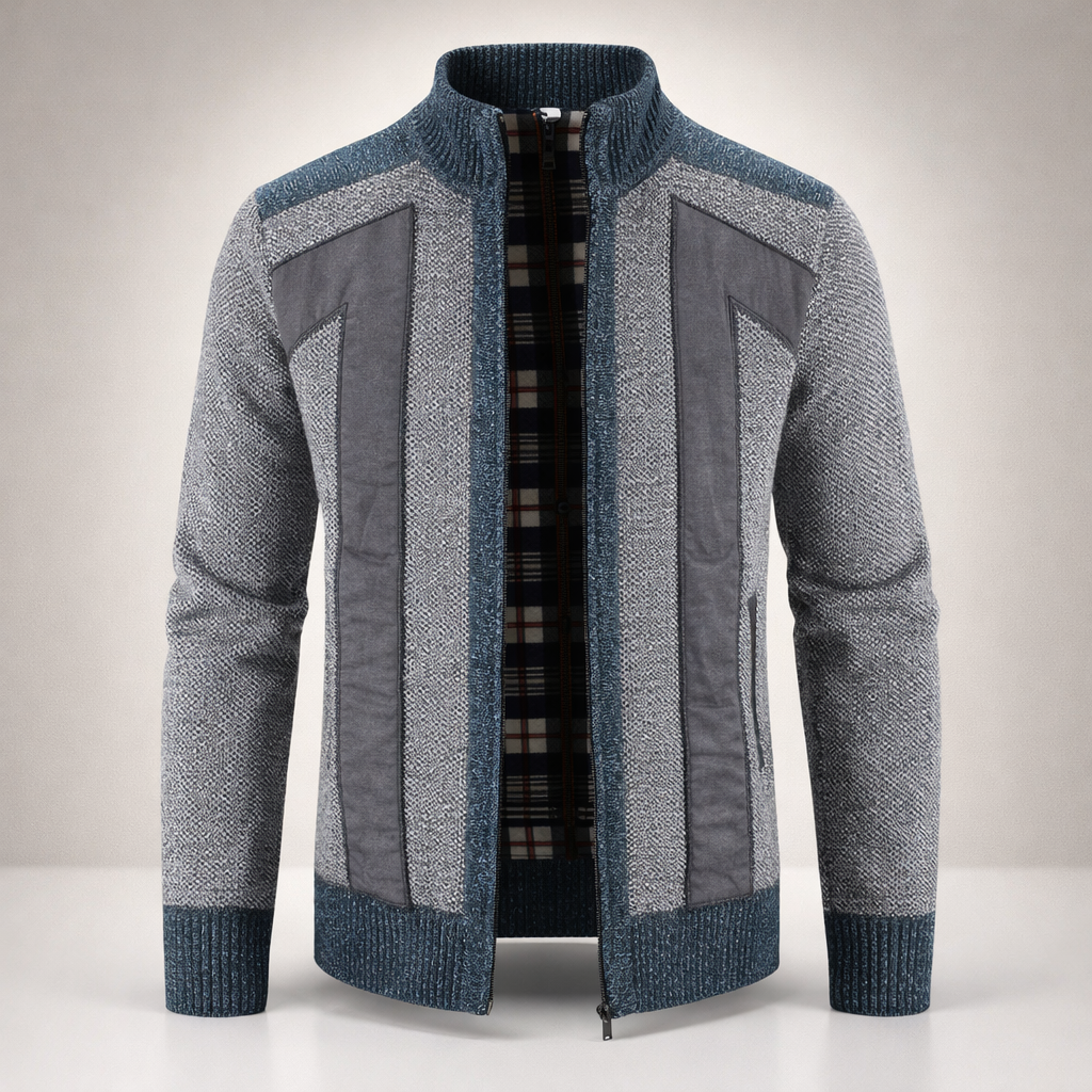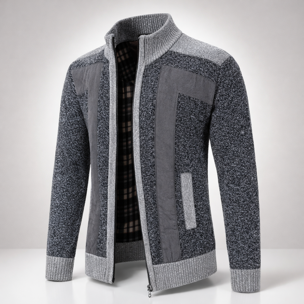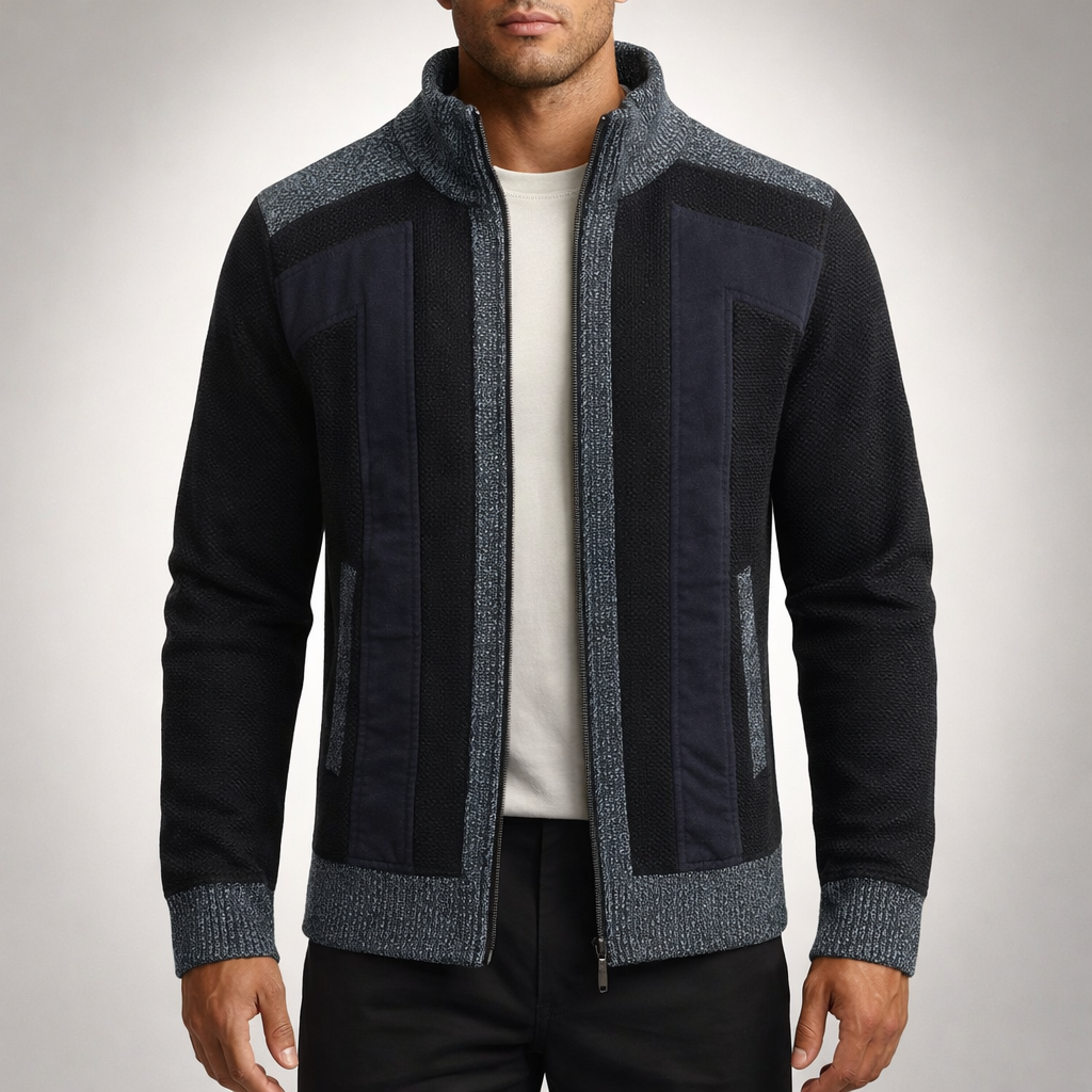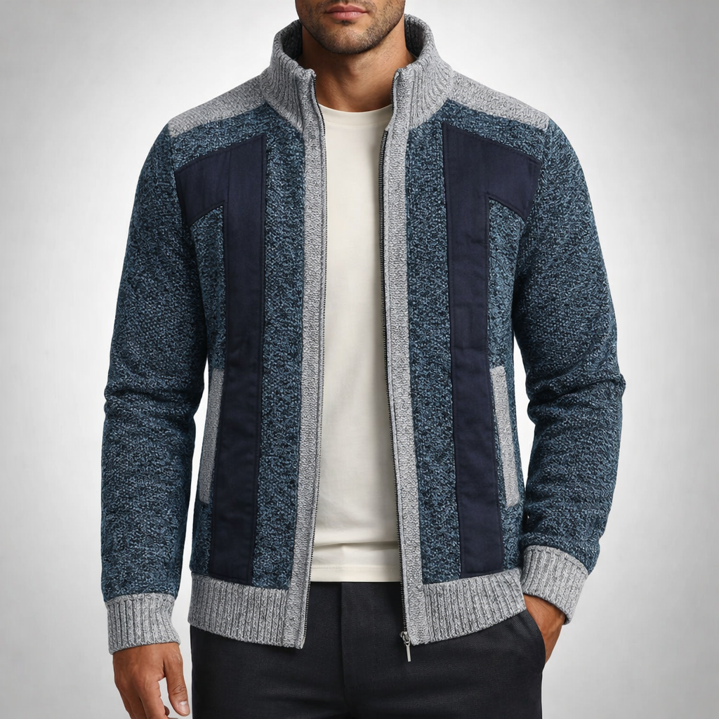 Designed for cooler days when structure and comfort both matter, this layered knit piece balances warmth with an easy, refined profile. A high ribbed collar shields the neck from wind, while mixed knit panels add subtle depth and durability without feeling rigid. Inside, a soft lining keeps things smooth against the skin, making it comfortable from morning to night. Finished with a full-length zip and ribbed edges, it wears naturally over a tee or under outerwear, offering dependable warmth without bulk.
